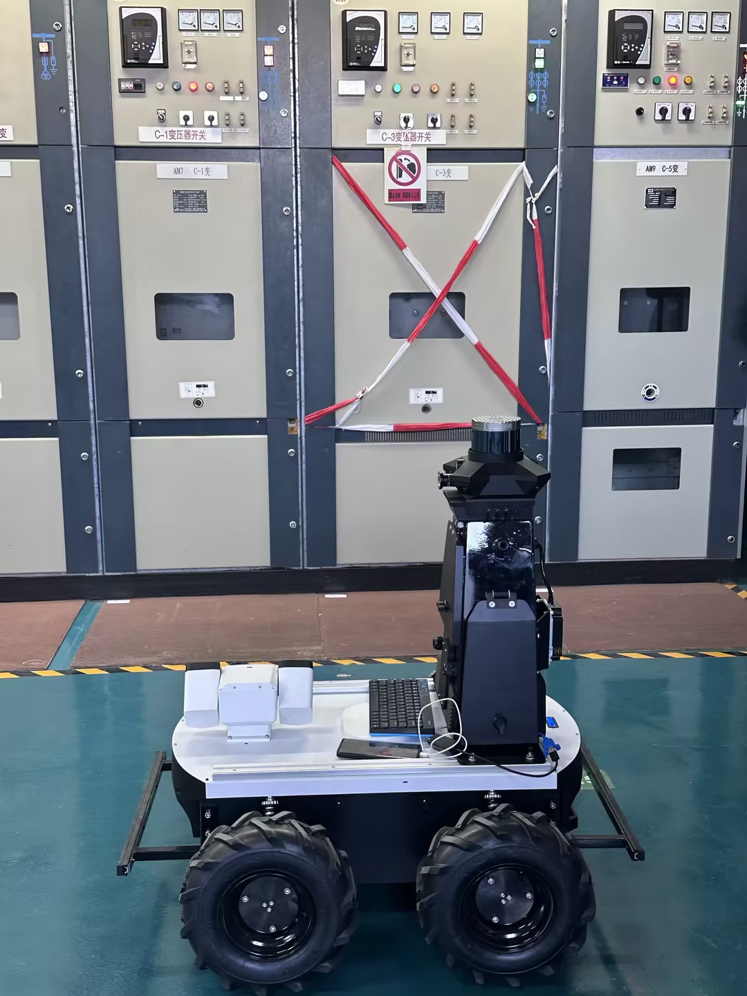 AI 火眼金睛,隐患无处遁形:搭载高清可见光摄像头、红外热成像仪和智能拾音器,既能精准读取仪表数据、识别开关状态,又能实时监测设备温度,测温精度精准可控,甚至能捕捉到设备异常振动的细微声响,误检率极低。演示中,它短短数十秒内就发现了模拟的 “电缆接头过热” 隐患,立即触发声光报警并上传后台。